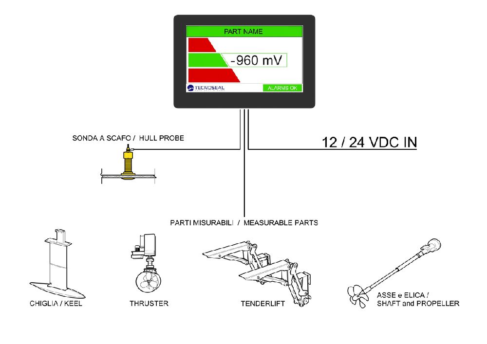 - Il sistema consente di monitorare costantemente i potenziali elettrochimici dello scafo e delle appendici, al fine di prevenire eventuali danni che potrebbero essere causati anche da interazioni impreviste con elementi dell'ambiente circostante e da correnti e tensioni vaganti.