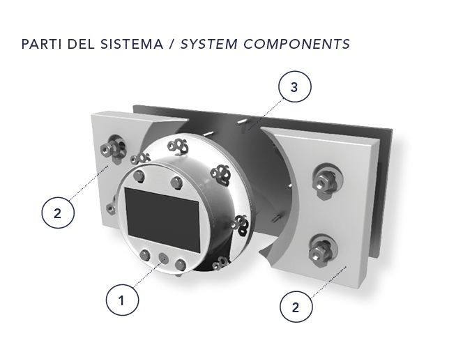 3. Base plate – For installing the system on the hull. The plate is equipped with hull-through pins for the connections of the two cathodic protection systems (passive via sacrificial anodes and active via BOOSTER unit).